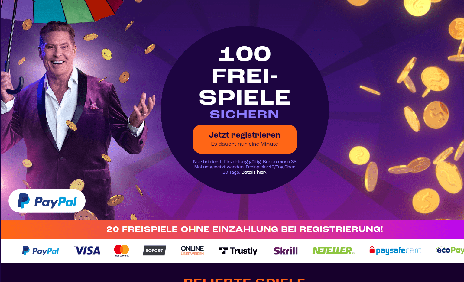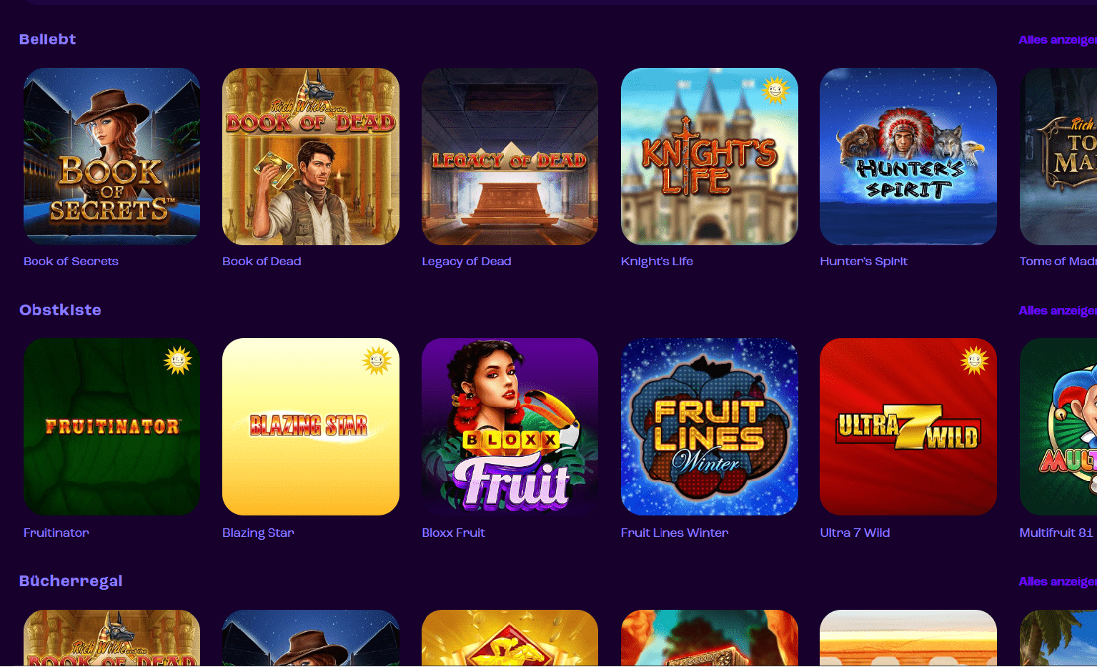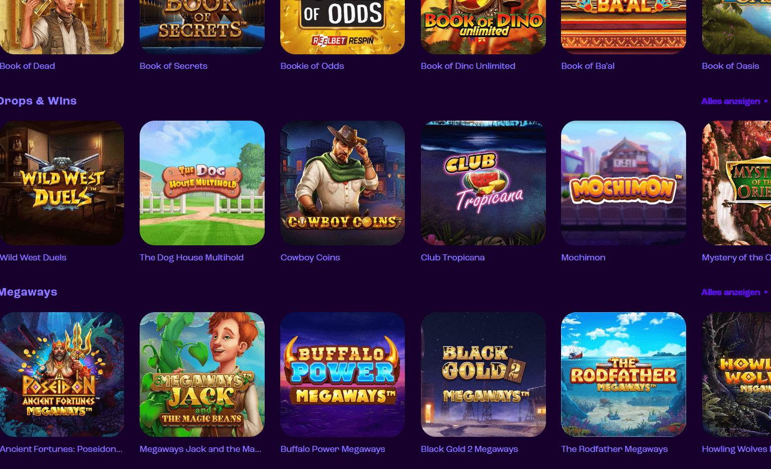 Caribbean Stud Poker, Three Card Poker und Ultimate Texas Hold'em sind einige Live-Spielvariationen im Poker-Genre, die im Hauptbereich der Tischspiele fehlen. Unter der Kategorie „Beliebte Spiele“ im Bereich der Live-Dealer-Spiele gibt es einige weitere Optionen für Top-Spieleanbieter. Mega Ball 100c, Deal or No Deal, Dream Catcher, Monopoly Live und Crazy Time sind die angebotenen Spiele.